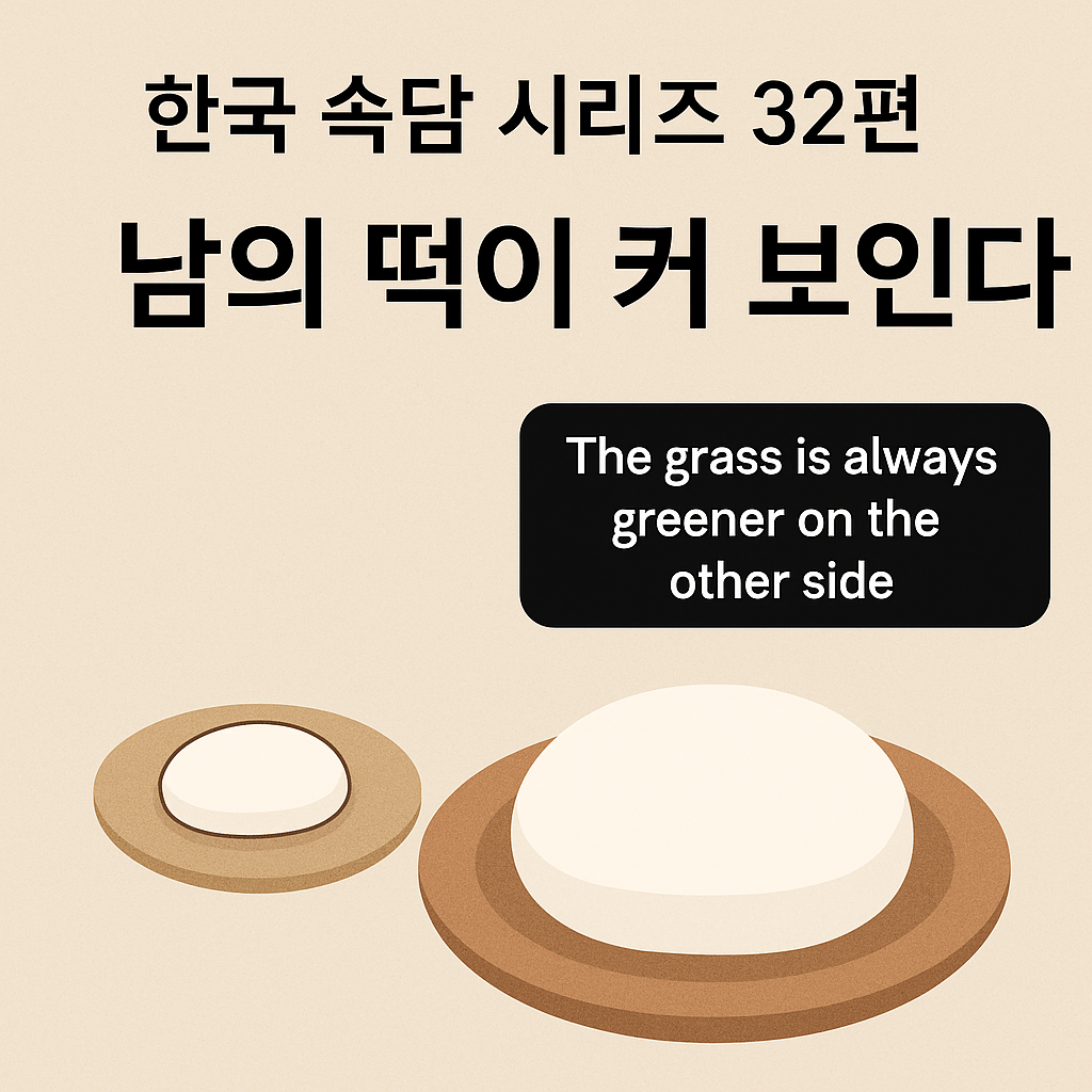 한국 속담 시리즈 32편남의 떡이 커 보인다🪵 1. 속담 뜻풀이**"남의 떡이 커 보인다"**는자신이 가진 것보다 남이 가진 것이 더 좋아 보이고 부러워 보이는 심리를 표현한 속담이에요.실제 크기나 가치와는 상관없이, 비교심과 욕심이 만든 착각을 꼬집는 말이죠.🪞 2. 삶의 예시친구가 새 휴대폰을 샀을 때, 내 것도 멀쩡하지만 괜히 내 것이 초라해 보여요.옆집 아이가 더 좋은 학교에 다닌다며 우리 아이가 부족하다고 느껴질 때가 있어요.하지만 실제로는 각자의 형편과 사정, 타고난 배경이 다르기 때문에 남을 부러워하는 건 불필요한 비교일 수 있어요.🌏 3. 외국의 유사 속담과 비교미국 "The grass is always greener on the other side."→ "다른 쪽 잔디가 항상 더 푸..