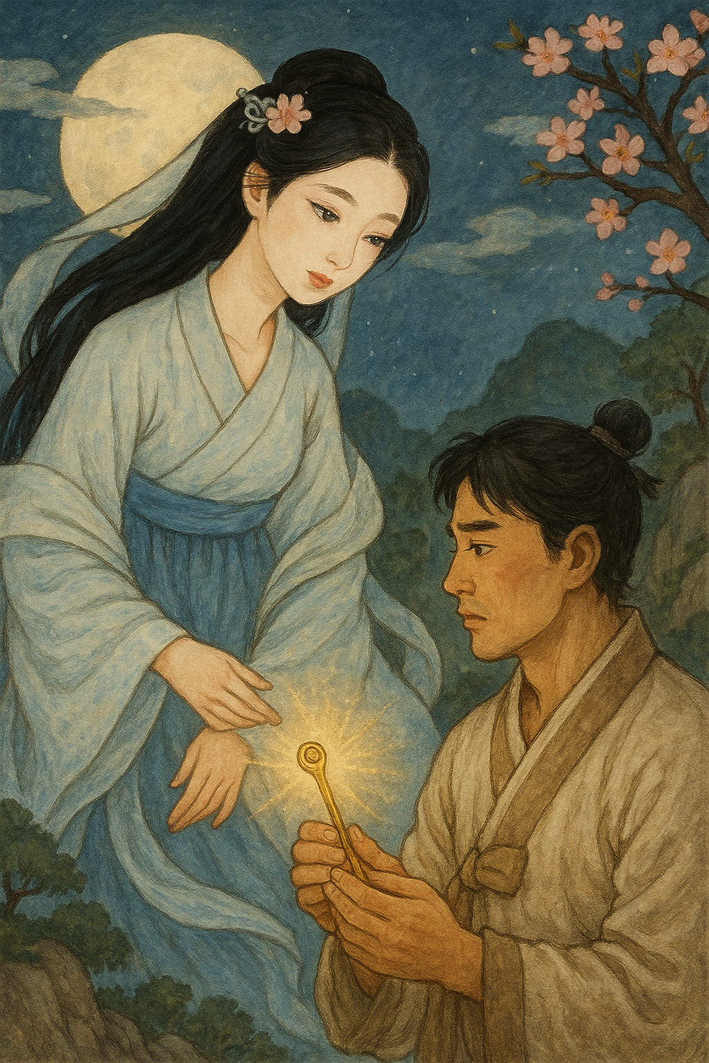 선녀는 자신의 머리에서 은빛으로 빛나는 비녀를 뽑아 청년에게 건네며 당부했어. “이 비녀를 소중히 간직해 주세요.