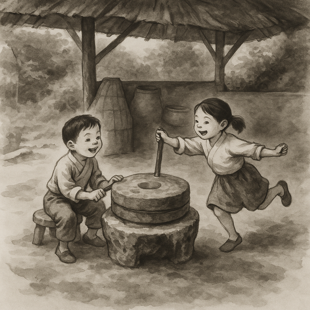 그 옆에서 아이들은 맷돌을 따라 돌리며 웃고 노래했지요.