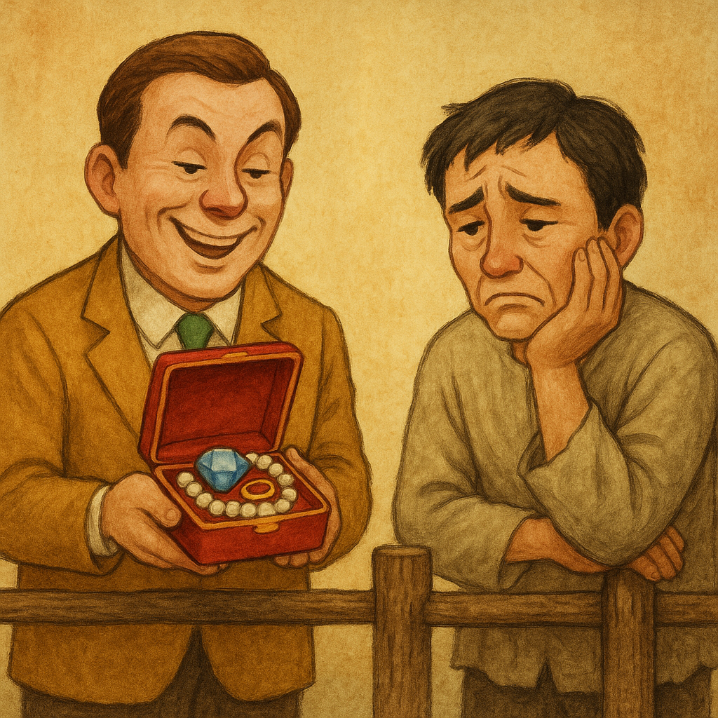 The Korean proverb “아홉 가진 놈이 하나 가진 놈을 놀린다” literally means