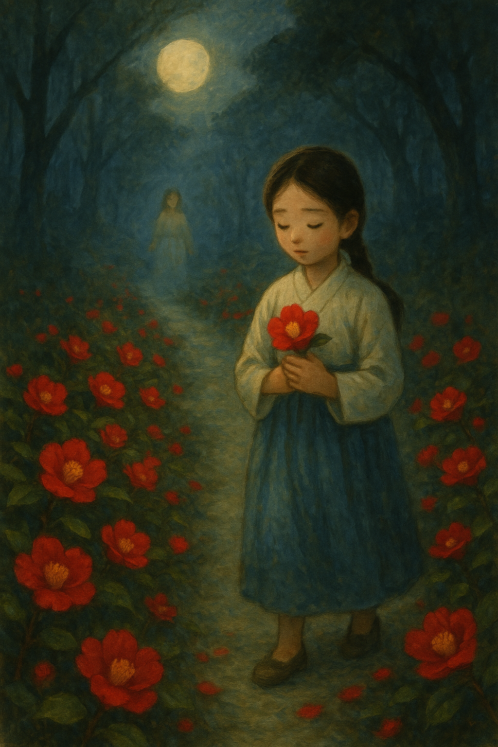 소녀가 동백꽃이 핀 길을 따라 걷자, 멀리서 어머니의 따뜻한 목소리가 들려왔어요.