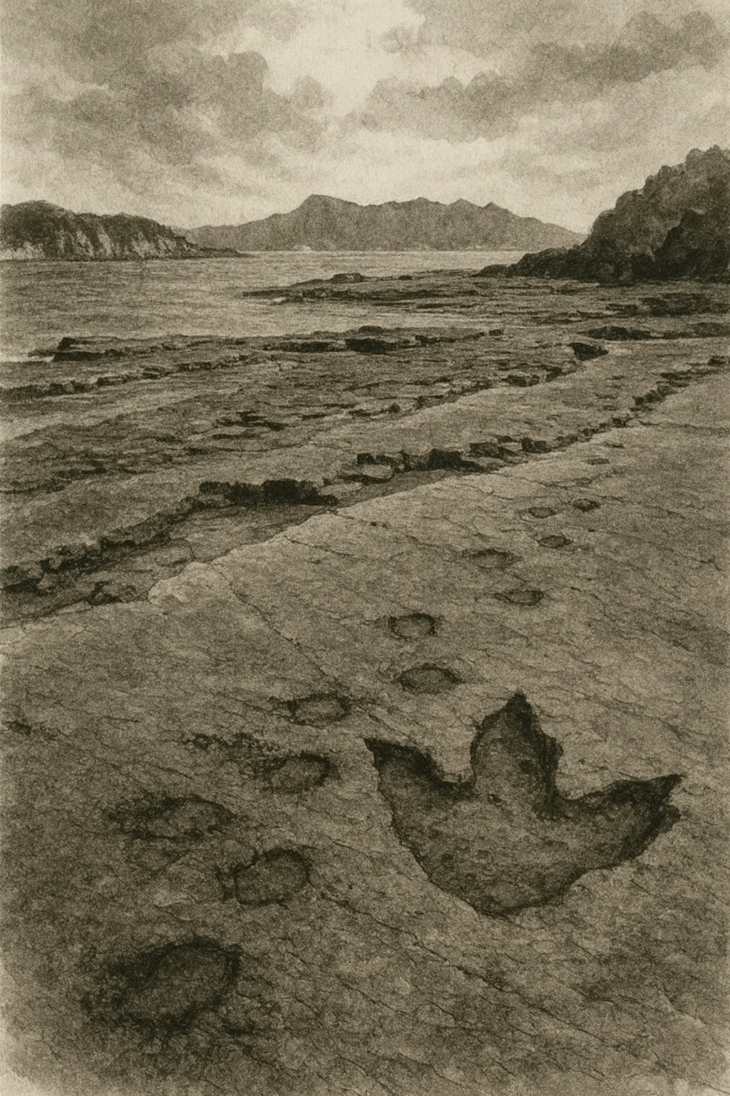 아이들은 그 발자국을 보며 옛 전설을 떠올리고, 상상 속 공룡이 진짜로 마을을 지켰다고 믿습니다.