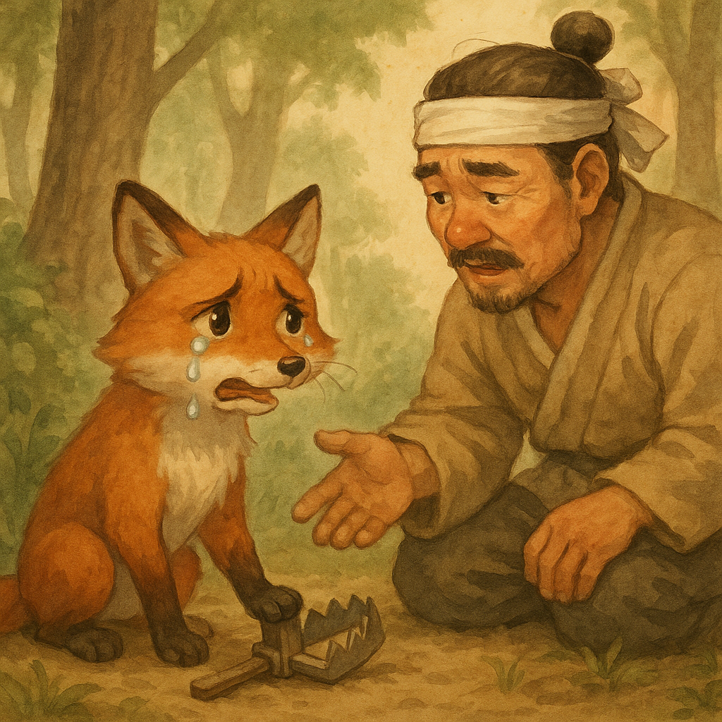 여우는 일부러 덫에 앞발을 살짝 걸어 놓고, 아픈 척하며 울었어요.