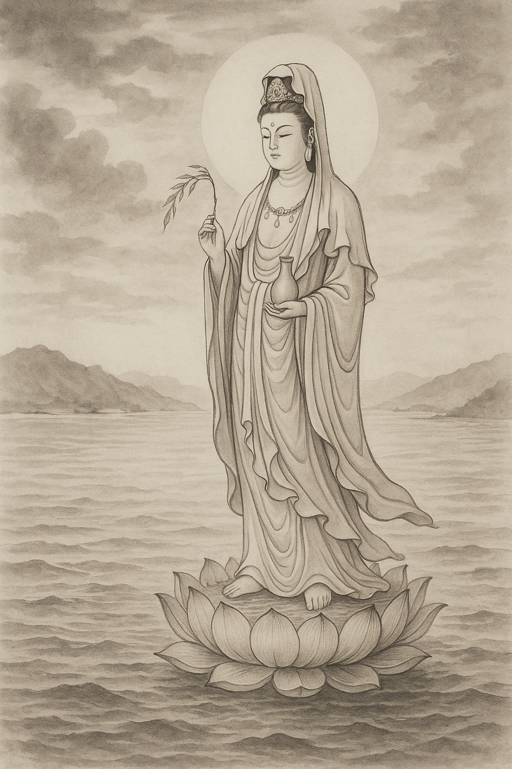 그 여인은 거대한 연꽃 위에 서서 손에는 정병(淨甁)을 들고 있었는데, 그 물을 바다 위에 뿌리자 거센 파도가 잦아들고 사람들은 무사히 육지로 돌아올 수 있었습니다.