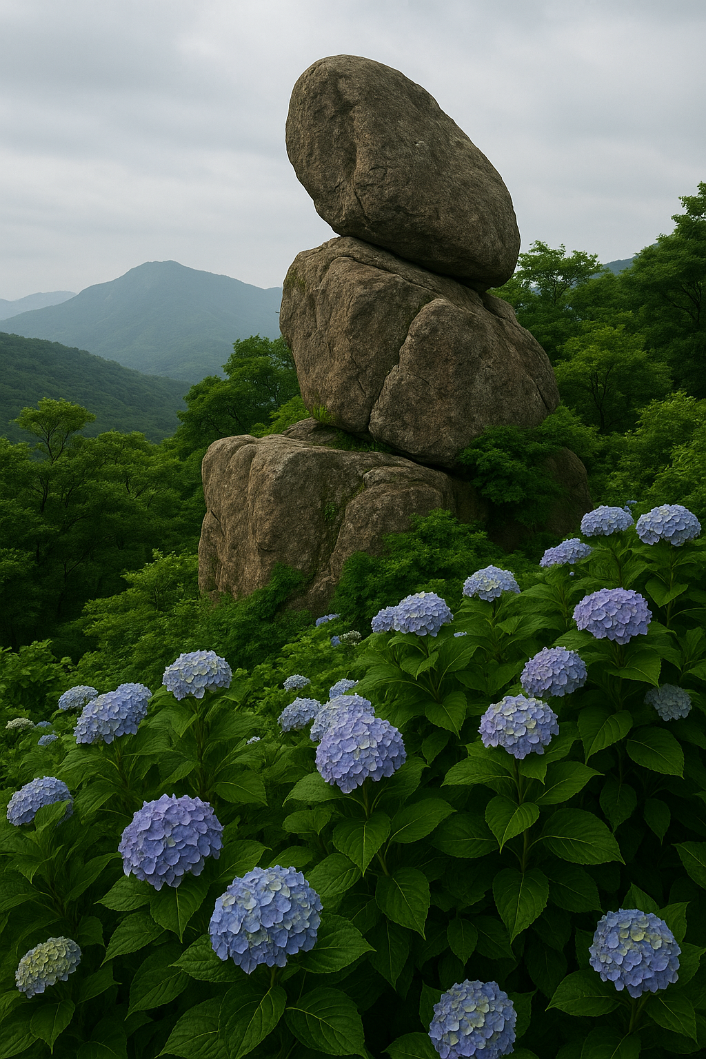 이 바위에는 신비한 전설이 전해지는데, 수국이 처음 피기 시작한 날, 마을 소녀 ‘나리’가 눈물로 기도하며 그 바위 앞에 앉아 있었다고 해요.