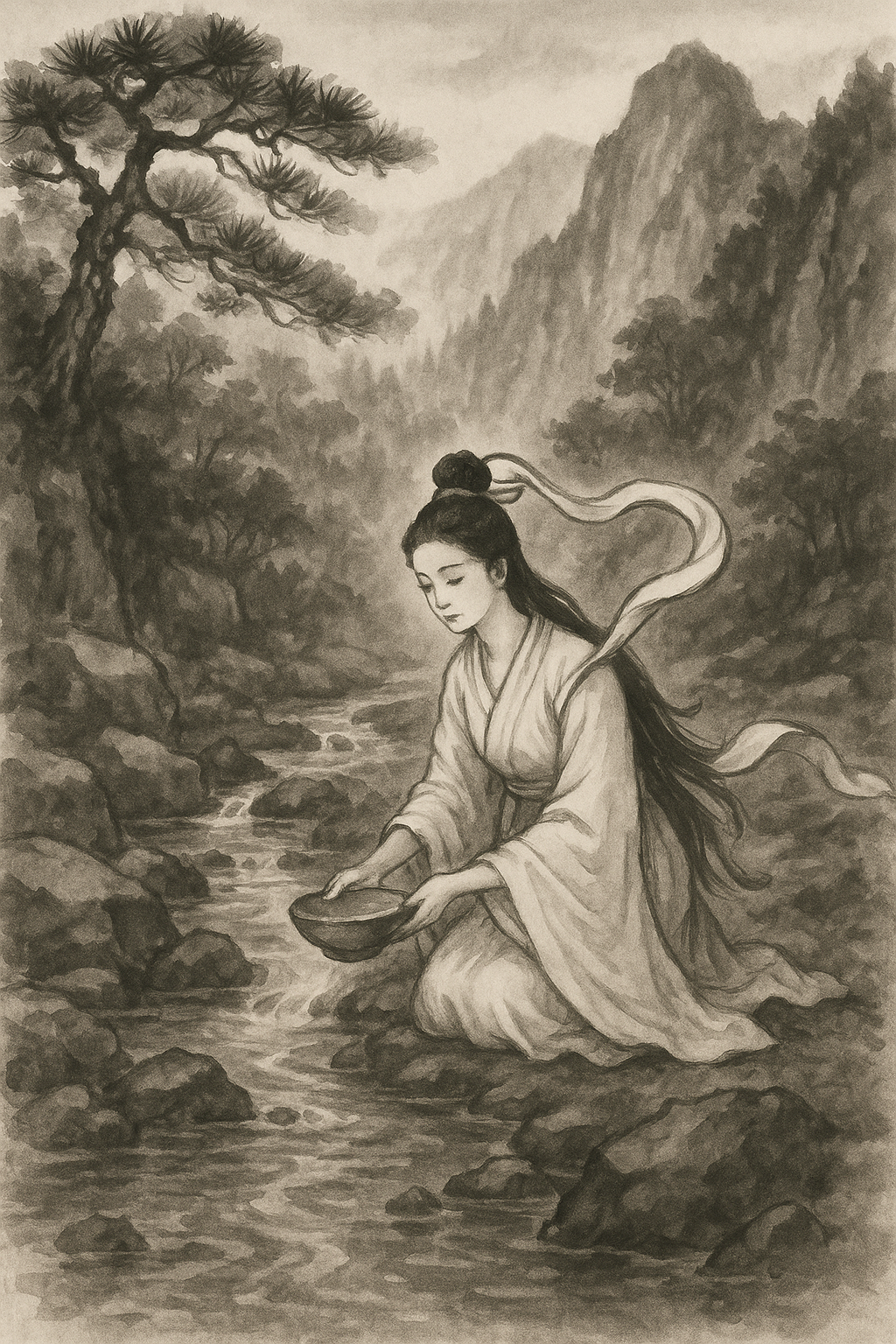 소년은 두려움에 떨었지만, 선녀는 부드러운 미소로 다가와 맑은 물을 떠 주며 말했습니다.