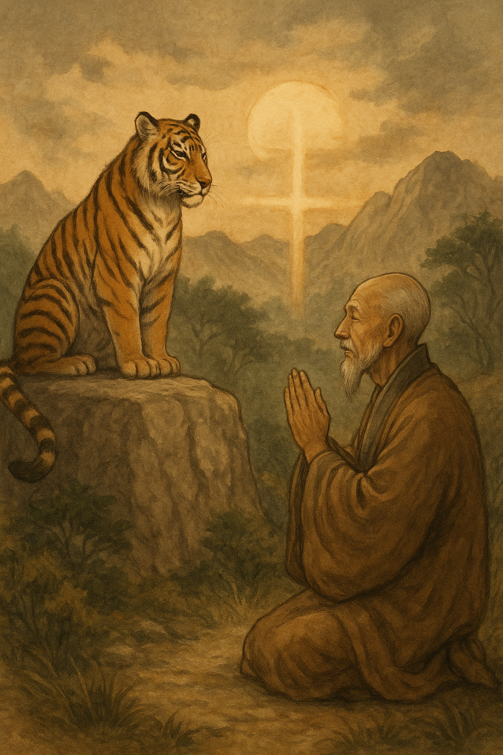 호랑이는 그 말에 반응하듯 고개를 끄덕이더니, 멀리 있는 바위 위로 올라가 앉았고, 곧이어 해가 바위를 비추며 십자 형태의 그림자가 생겨났어요.