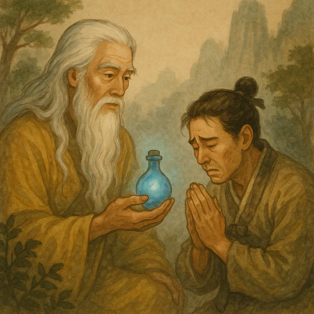 선인은 농부의 진심을 보고 단 한 번만 약을 쓸 수 있도록 허락했어요.