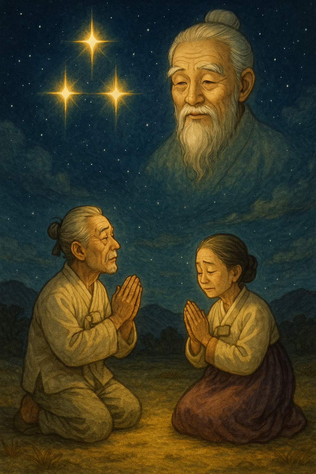 마을에 오래도록 아이가 없던 부부가 있었는데, 그들은 매일 밤 삼태성을 향해 절하며 기도했어요.