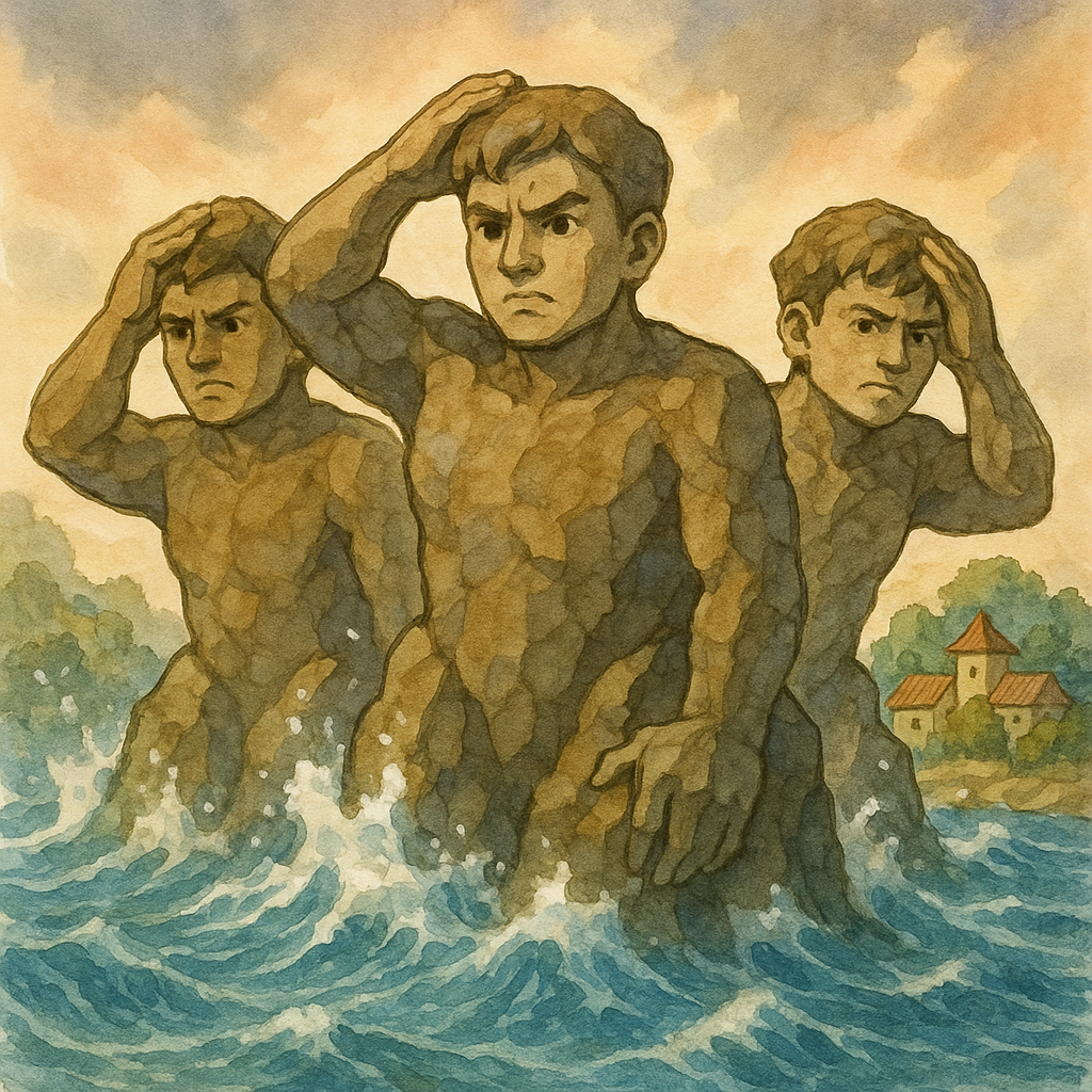 그 순간, 번개와 함께 삼형제는 강을 막는 거대한 바위로 변해 물길을 돌려 마을을 지켰다고 해요.