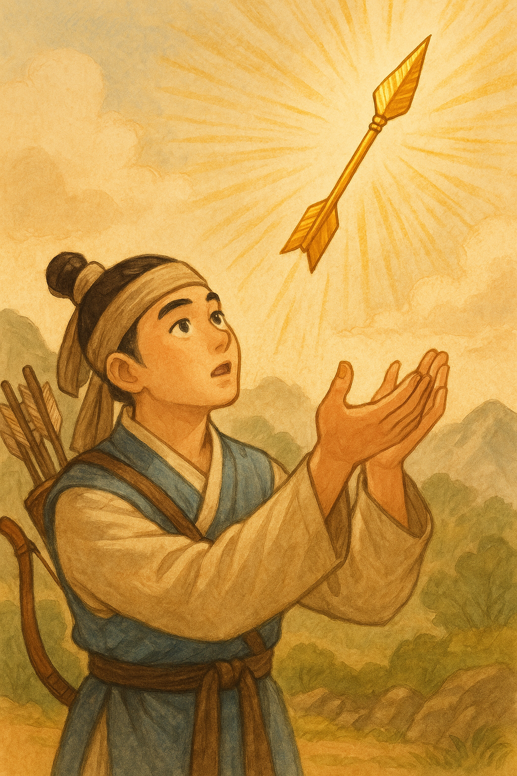 그중 한 화랑이 마음을 닦고, 욕심 없이 백성을 위한 기도를 올리자 하늘에서 빛나는 금빛 화살이 내려왔어요.