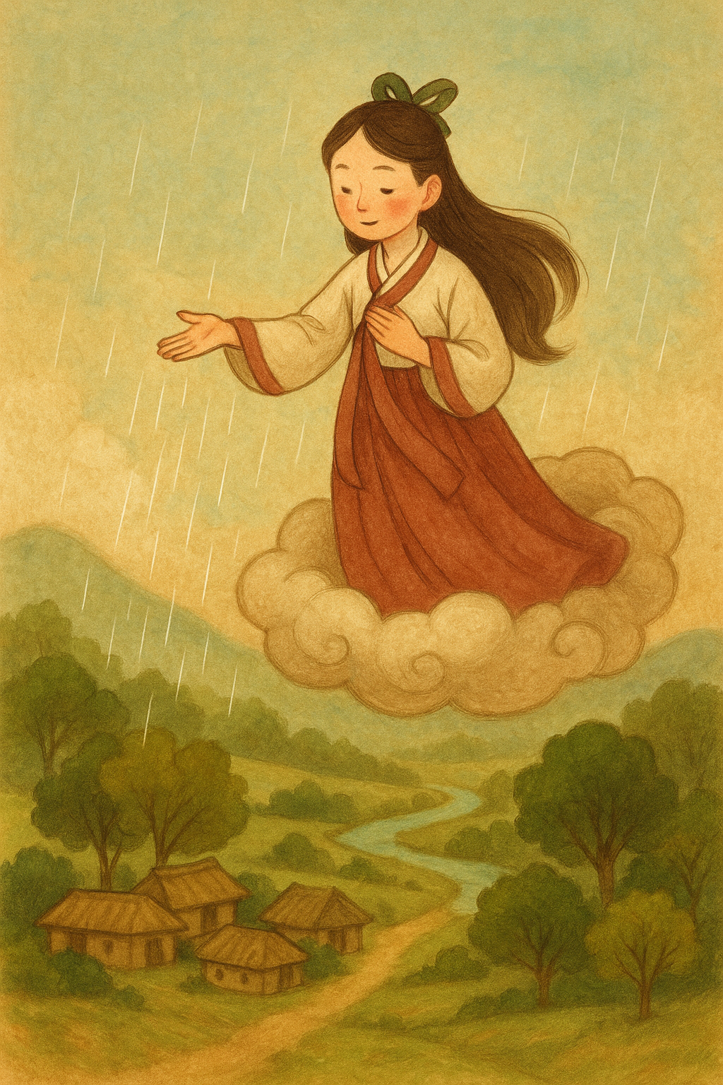 옥황상제는 딸의 간청을 듣고 구름을 모아 비를 내려 마을을 구했다고 해요.