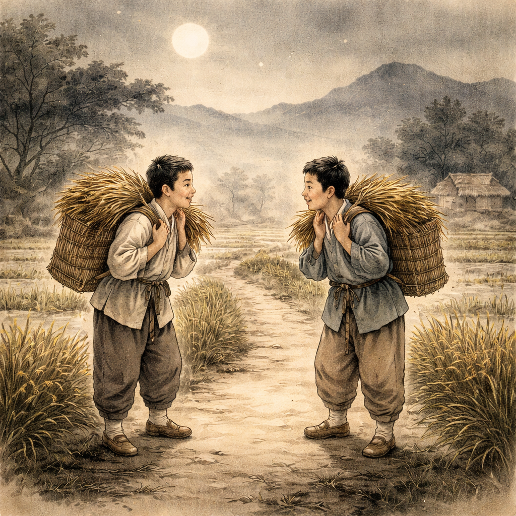그리하여 형은 조용히 일어나 자루에 벼를 담아 동생의 곳간에 옮겨두었어요. 그런데 놀랍게도, 같은 시각에 동생도 말했죠.