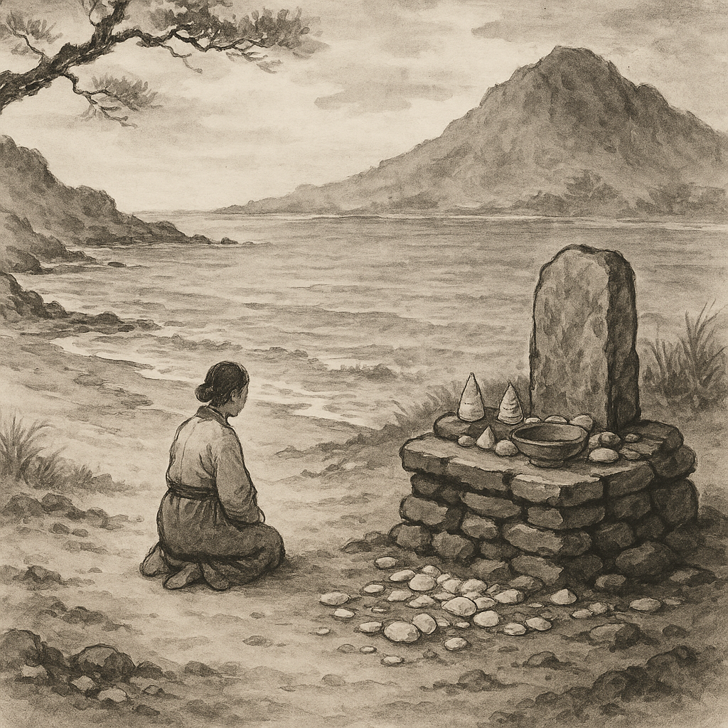 마을의 무녀는 해변의 넓은 모래밭에 제단을 만들고, 조개껍데기와 돌을 정성껏 쌓아 올렸죠.