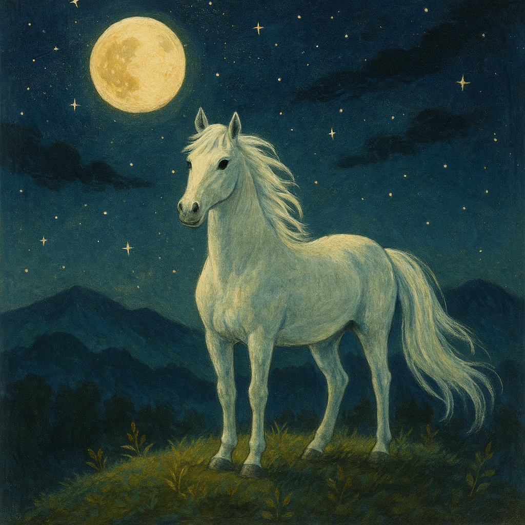 전설에 따르면, 어느 날 한 농부가 산에서 길을 잃고 헤매다가 은빛 갈기를 가진 말이 나타나 길을 안내해줬어.