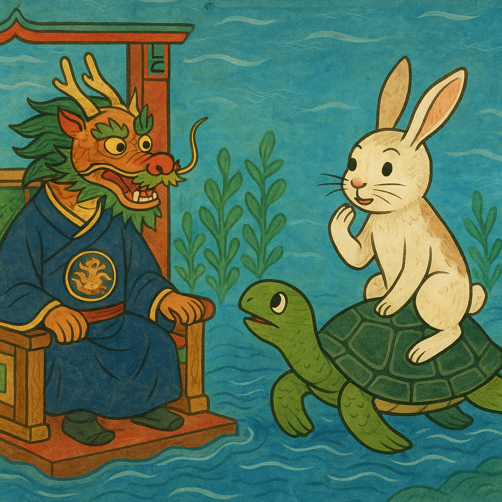 그렇게 토끼는 꾀와 재치로 목숨을 건지고, 용왕은 어쩔 수 없이 다시 자라를 바다로 불러들였답니다.