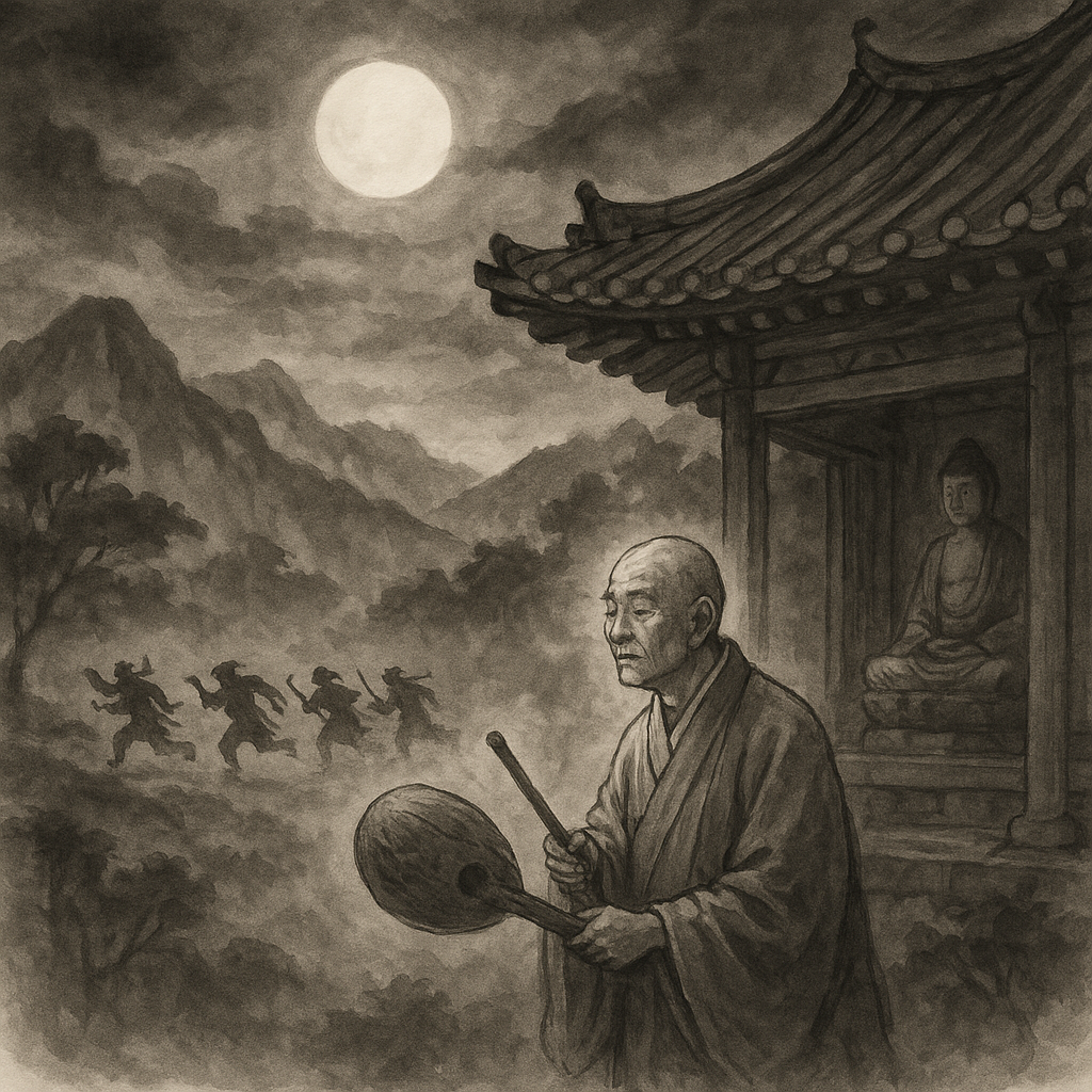 그때 산속 암자에서 수행하던 한 노승이 있었는데, 그는 매일 달이 뜨는 밤이면 법당 앞에서 목탁을 두드리며 기도를 올렸습니다.