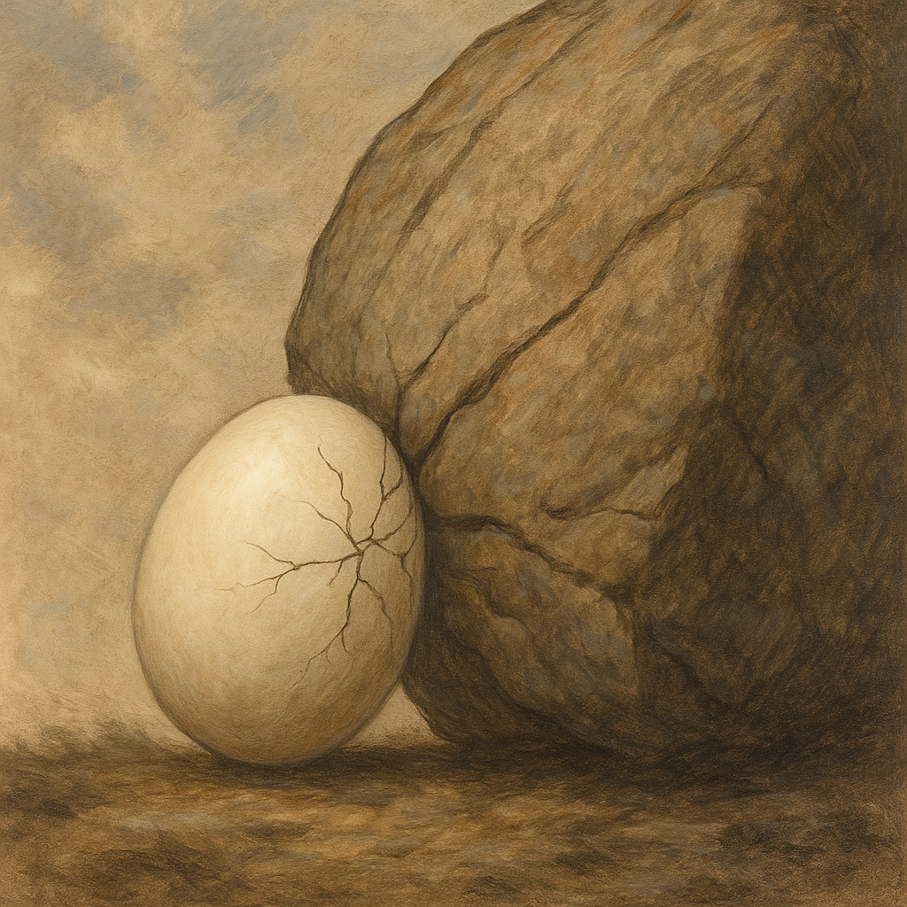 **"계란으로 바위 치기"**는 힘없고 약한 존재가 강한 상대를 무리하게 대적할 때, 애초에 승산이 없고 헛된 시도라는 뜻이에요.