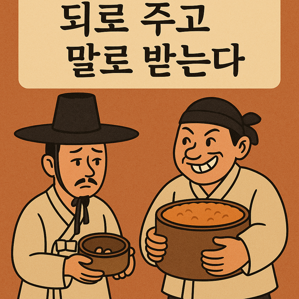 **“되로 주고 말로 받는다”**는 작은 것을 주고, 그보다 훨씬 큰 것을 받으려는 얄밉고 계산적인 태도를 말해요.