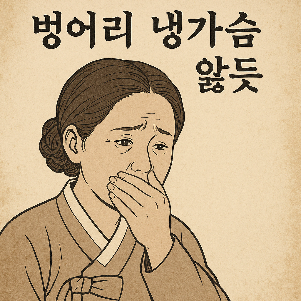 **"벙어리 냉가슴 앓듯"**은 속으로는 괴롭고 답답하지만 겉으로는 표현하지 못하는 상황을 비유한 말이야.