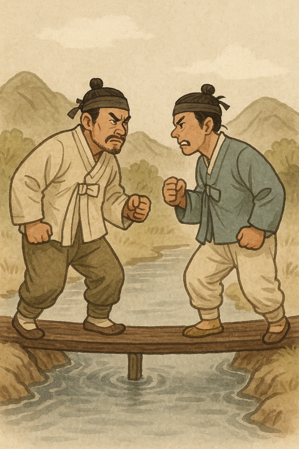 **“원수는 외나무다리에서 만난다”**는 싫어하고 피하고 싶은 사람이라도 언젠가는 예상치 못한 곳에서 마주치게 된다는 뜻이에요.