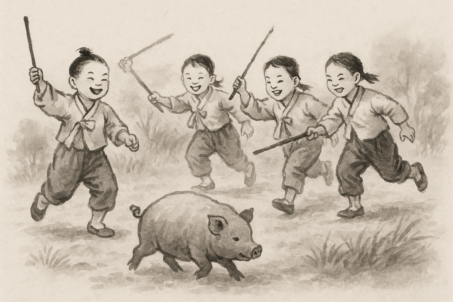 논두렁길을 달리며 웃던 아이들, 그들의 ‘꿀꿀~’ 소리 속엔 일상의 노래와 마을의 정이 담겨 있었지요.