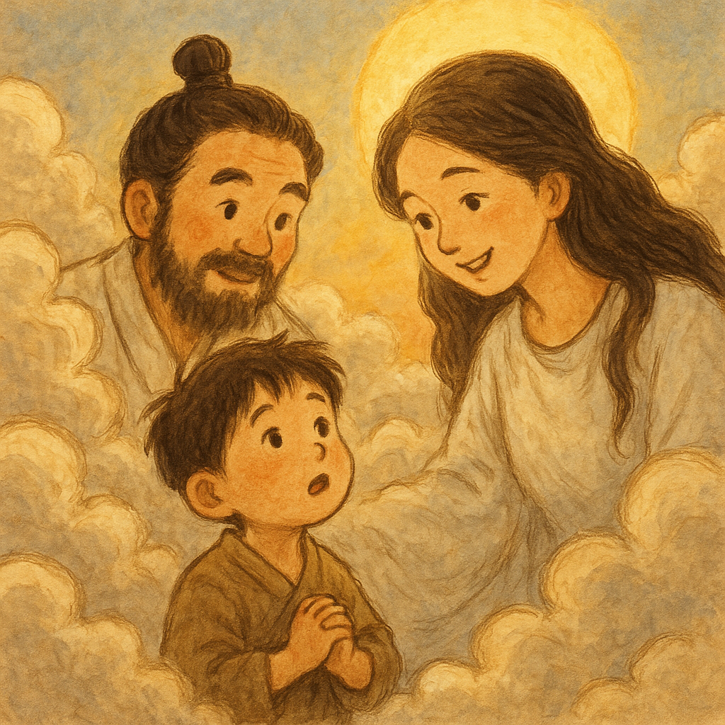 He found himself in Heaven’s Realm, where clouds formed grand halls and stars hung like lanterns. Waiting before him were two radiant figures: the Heavenly Mother and the Heavenly Father.