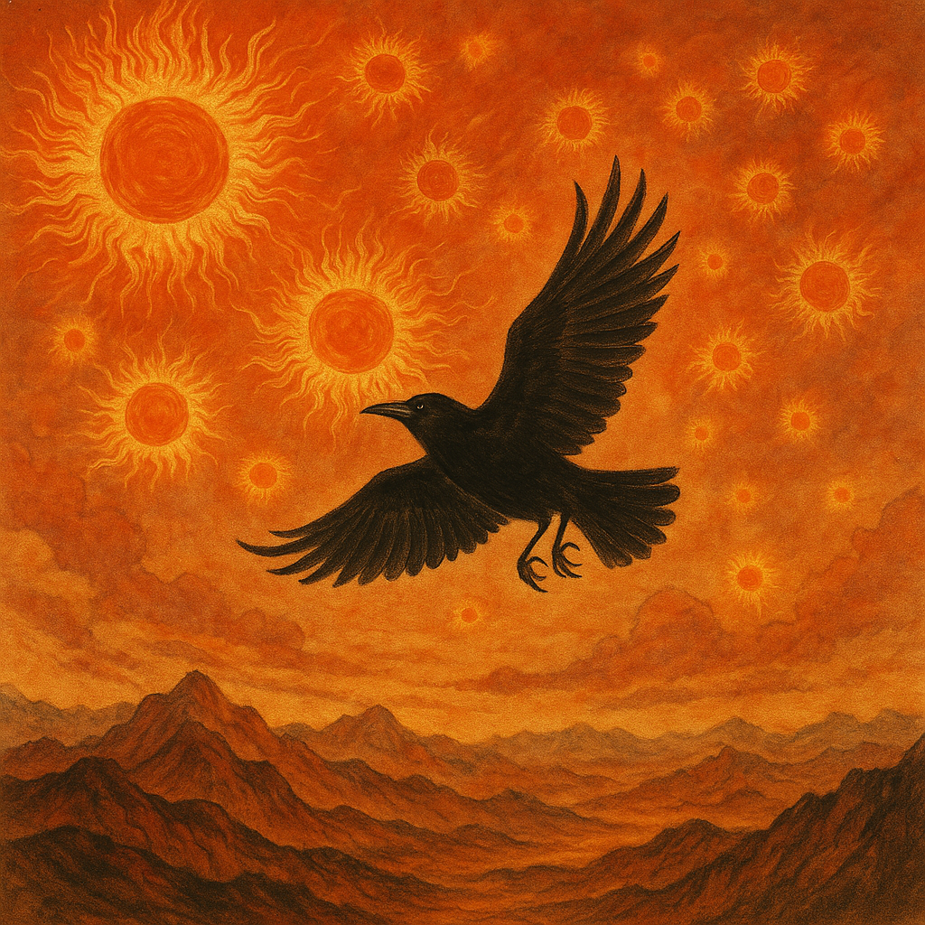 Moved by his courage, the Sun Spirit granted him a single spark of her flame. The crow flew downward, wings trembling as the fire scorched his feathers. He soared through the mist, scattering light across mountains and seas. The dark sky split open, and the first sunrise bathed the world in gold.