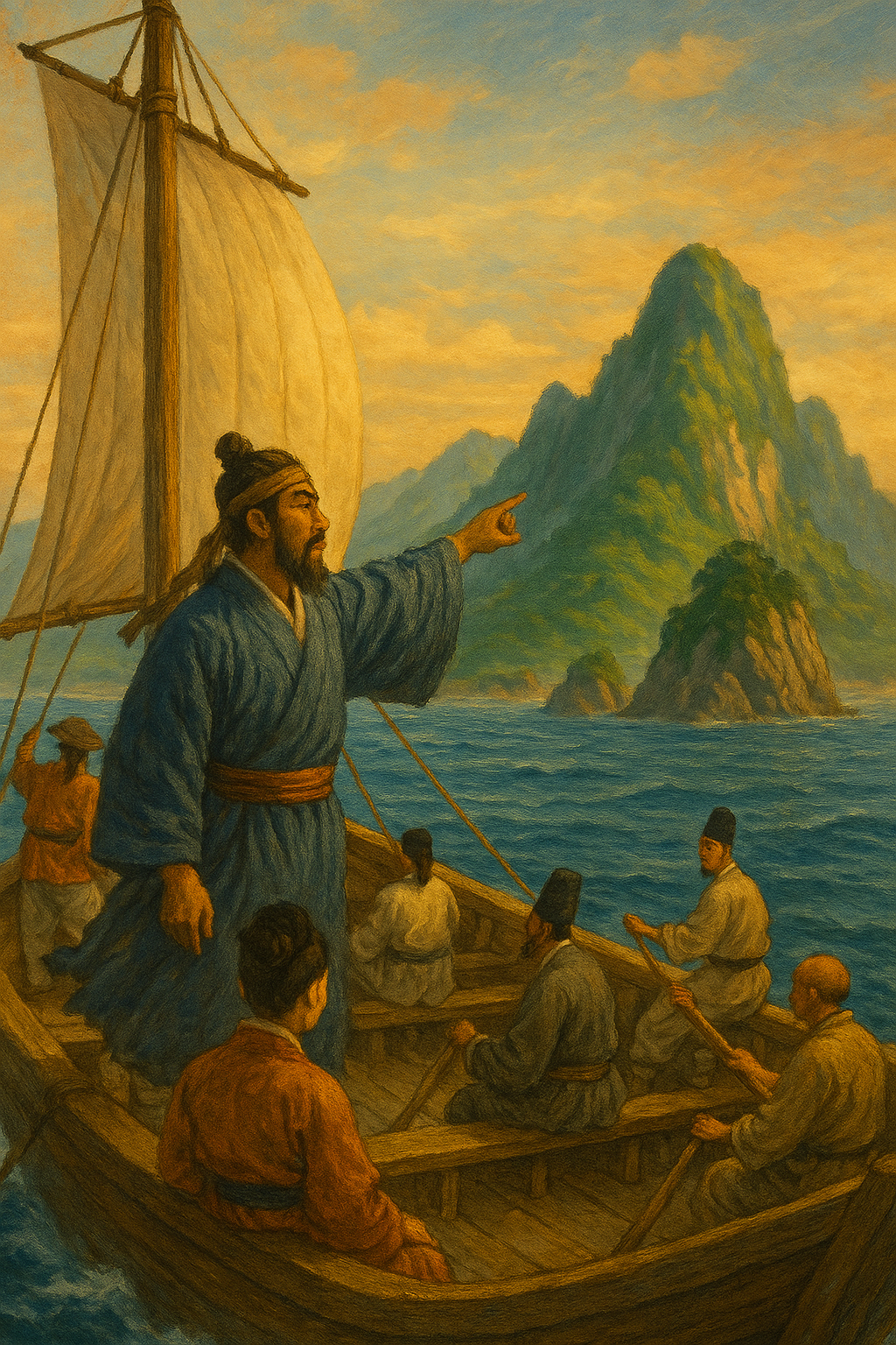 Obsessed with the promise of immortality, the emperor sent a fleet of ships eastward, led by a wise young scholar named Xu Fu. They sailed for months across stormy waters until they reached the mysterious islands of the Korean Peninsula, where emerald forests and mist-covered peaks rose from the sea.