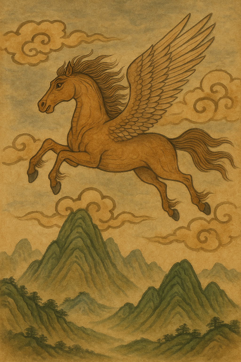 Long ago, during the days of ancient kings, there lived a noble warhorse said to be born from the union of a dragon and a mare. The horse, with scales shimmering beneath its mane and eyes bright like morning stars, was known as Yongma, the Dragon Horse.
