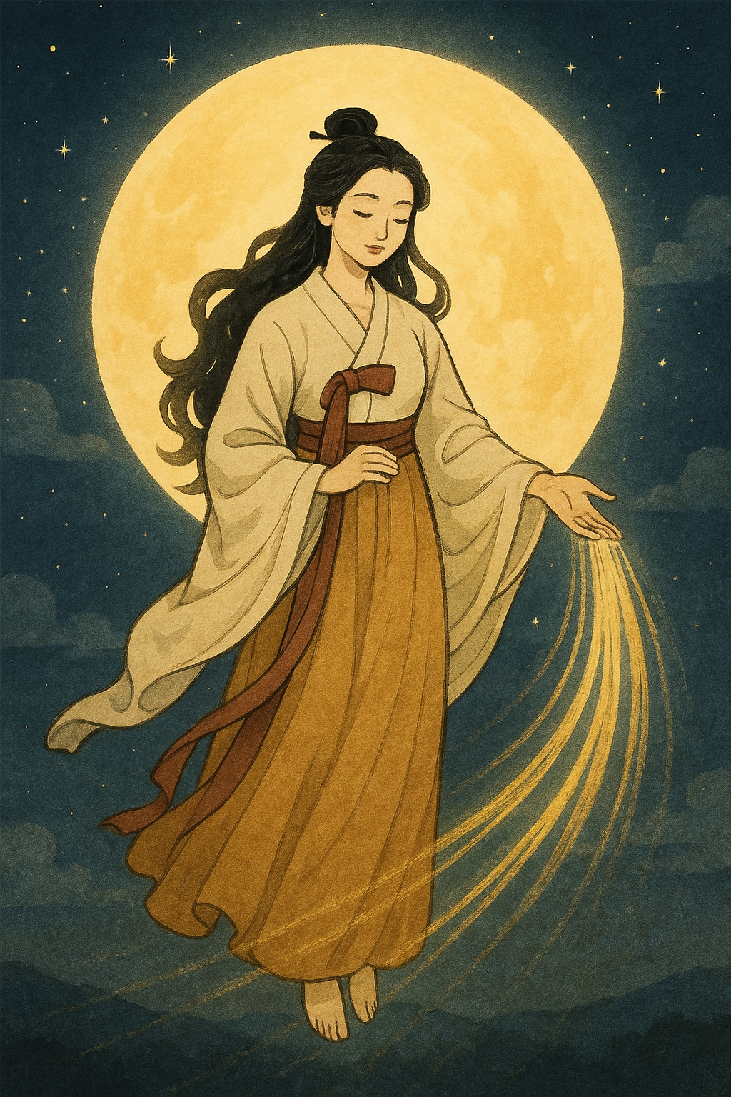 In that shining realm lived the Moon Goddess, a celestial maiden called Wolgung Seonnyeo. Her robes shimmered like silver mist, and her voice was said to calm even the fiercest tides. Each night, she looked down upon the earth, watching over those who traveled in darkness or wept beneath lonely skies.