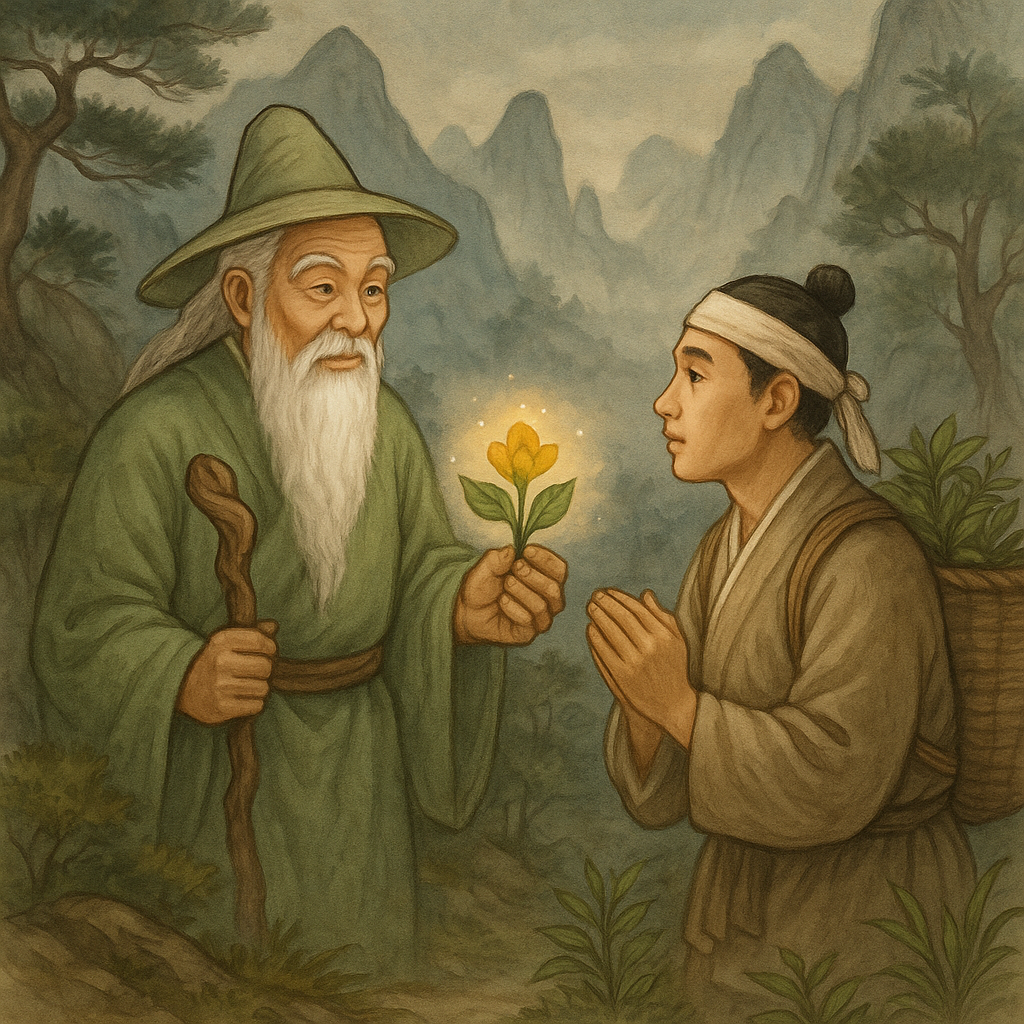 Long ago, deep within a misty mountain, there lived a humble herb gatherer who earned his living by collecting rare roots and plants for medicine. Though poor, he was honest and always bowed to the mountain before beginning his work, whispering,