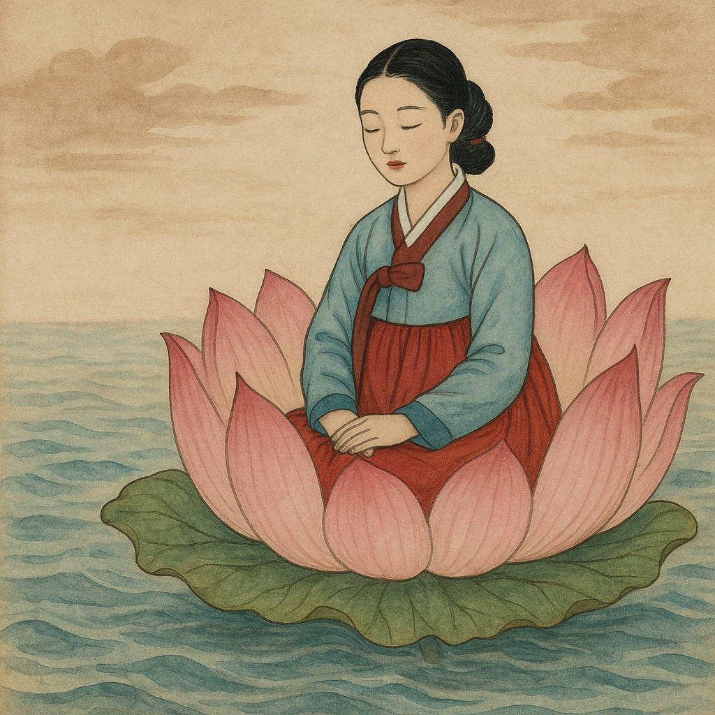 To help her father, she sold herself to sailors as a sacrifice to the Sea God in exchange for the necessary rice. She was thrown into the sea, but instead of dying, she was saved by the Sea God and returned to the world in a lotus flower.