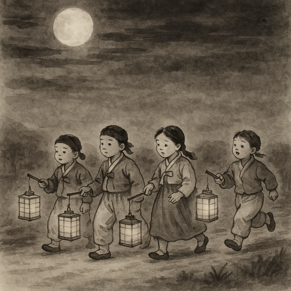 Children made and carried paper lanterns (chorong) lit by candles, walking together through fields and village roads.