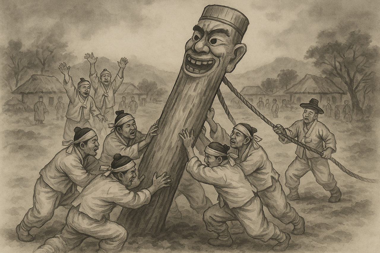 Jangseung Seugi Nori (장승세우기놀이), meaning “totem pole-raising play,” is a traditional Korean communal event where villagers carve, decorate, and erect jangseung — wooden guardian poles — at the entrance of the village.