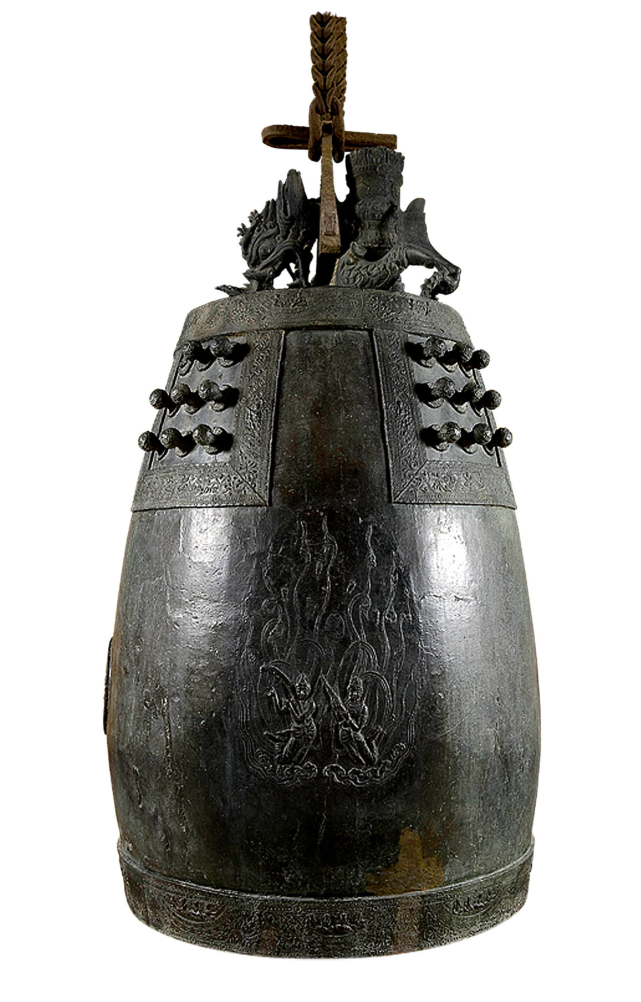 At the top is a dragon-shaped suspension hook, symbolizing ascension toward the heavens. Below the hook lies a raised lotus design encircling the bell’s shoulder, from which pairs of heavenly figures (apsaras) appear to emerge — their graceful forms symbolizing celestial harmony.