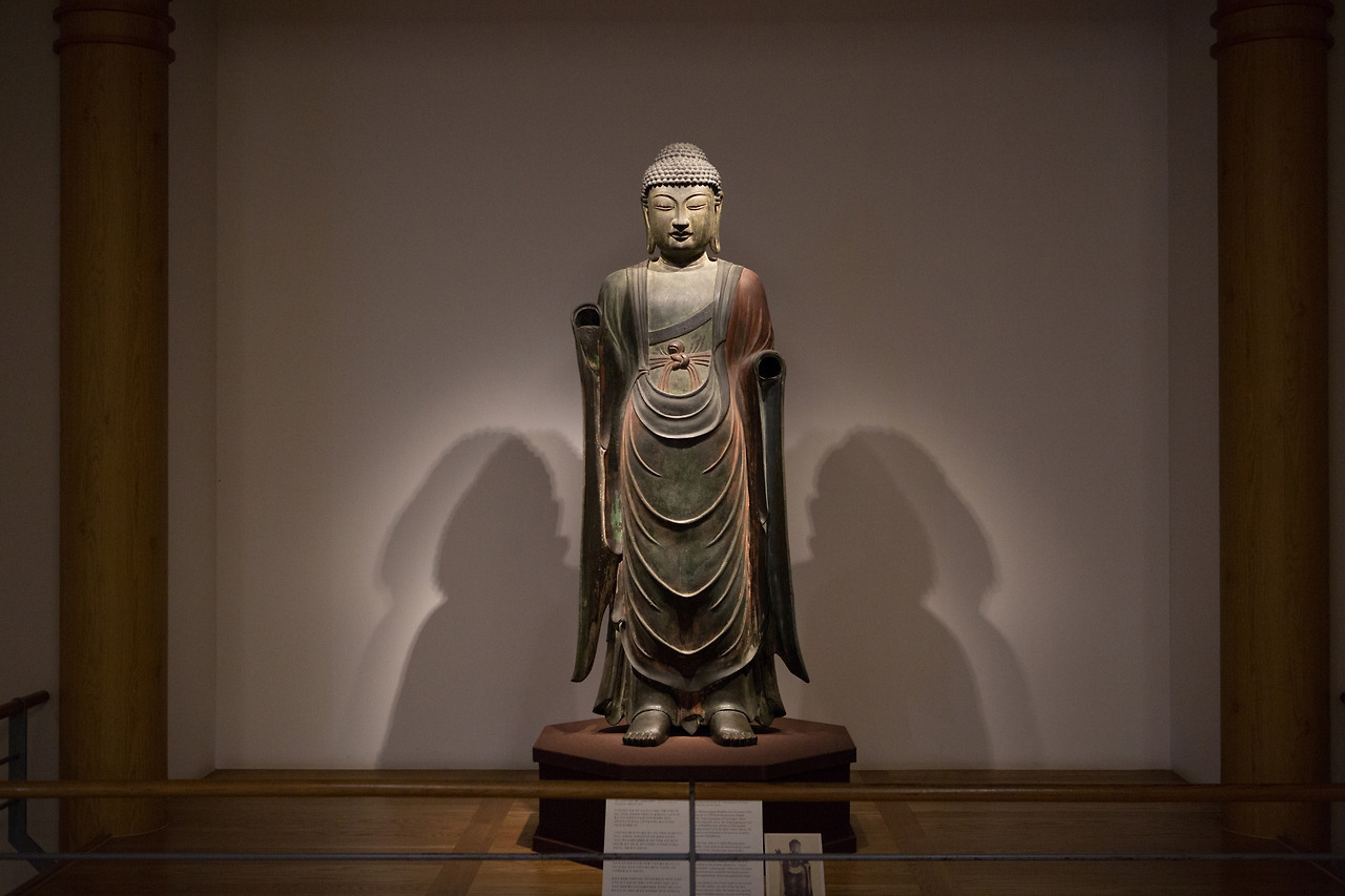 Though more than a millennium old, the Gilt-bronze Standing Medicine Buddha of Baengnyulsa Temple remains remarkably well preserved. Its gilded surface retains a soft, gentle glow, and its proportions show the technical excellence of Silla metal casting.